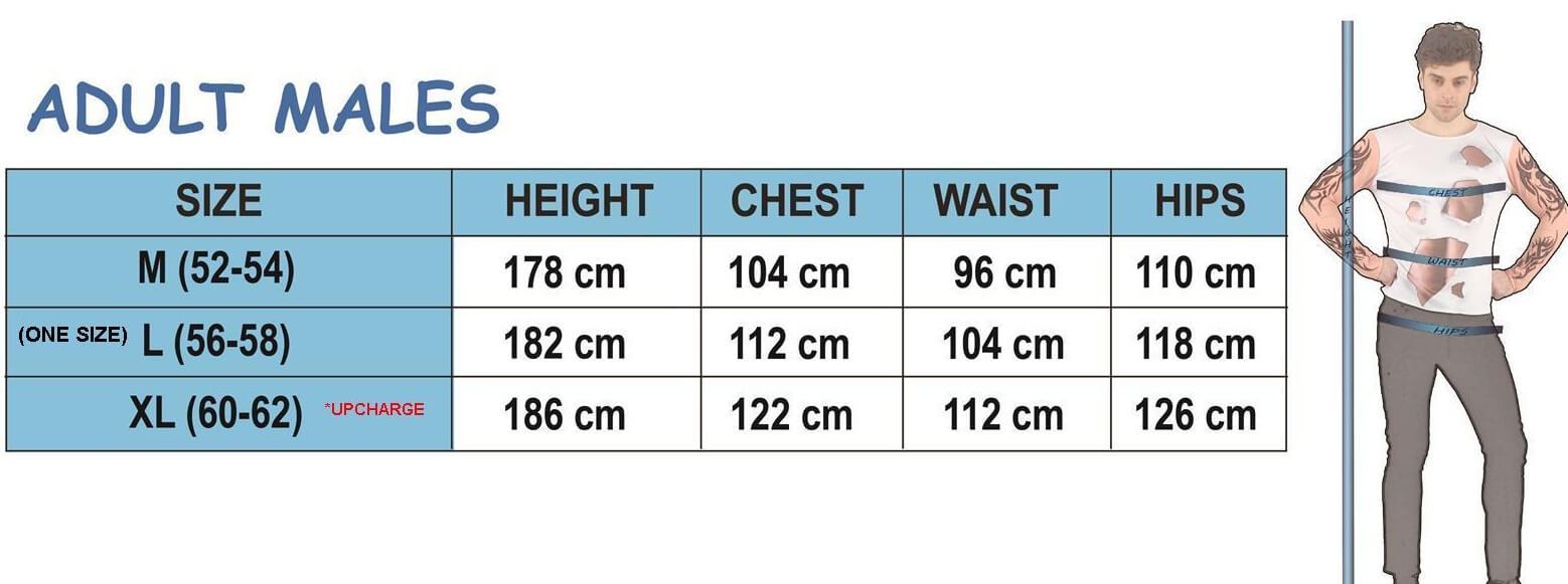 Vampirski kostim za odrasle dostupan je u dvije različite veličine, od L do XL. Radi lakšeg predstavljanja priložili smo i tablicu veličina u kojoj se mogu vidjeti samo pojedinačne veličine. Napisali ste mjere za visinu, grudi, struk i bokove istog kostima.
